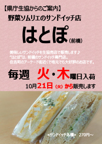 | 県庁店に前橋の 「はとぽ」のサンドイッチが入荷します。 |